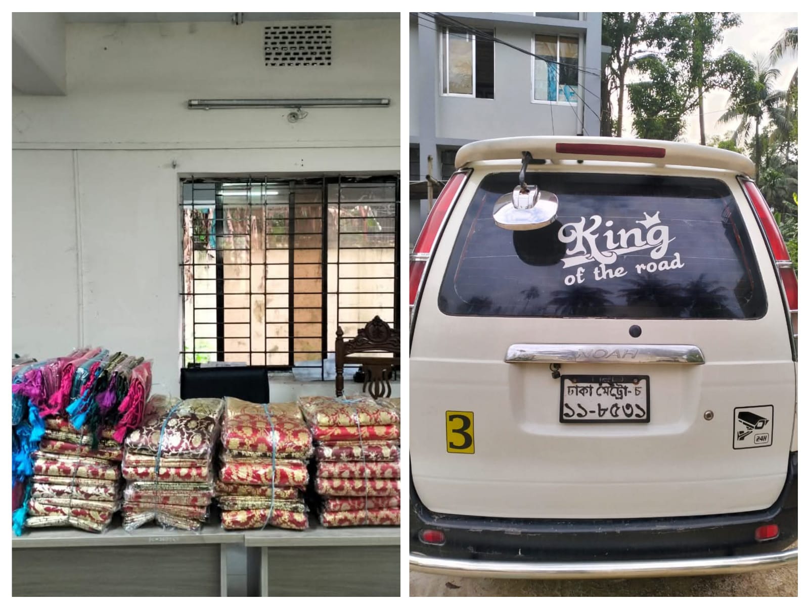 পরবর্তীতে তল্লাশি চালিয়ে গাড়িটির পেছনের সিট থেকে ৬০ পিস ভারতীয় বেনারশী শাড়ি, ৬৯ পিস কাঞ্জিভরম শাড়ি এবং ৪ পিস কাতান শাড়ি উদ্ধার করা হয়। সর্বমোট ১৩৩ পিস ভারতীয় শাড়ি জব্দ করা হয়েছে।