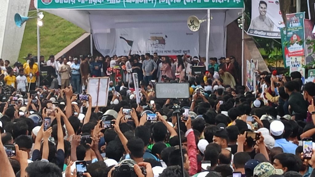 সিলেট শহীদ মিনারে অনুষ্ঠিত সমাবেশে বক্তব্য রাখেন আহ্বায়ক নাহিদ ইসলাম, মুখ্য সমন্বয়ক নাসিরুদ্দীন পাটওয়ারী, আখতার হোসেন, তাসনিম জারা, মুখ্য সচিব গোলাম মর্তুজা সেলিম, দক্ষিণ অঞ্চলের মুখ্য সমন্বয়ক হাসনাত আবদুল্লাহ, উত্তরাঞ্চল সমন্বয়ক সারজিস আলম, এবং কেন্দ্রীয় সদস্য ব্যারিস্টার নুরুল হুদা জুনেদ প্রমুখ।