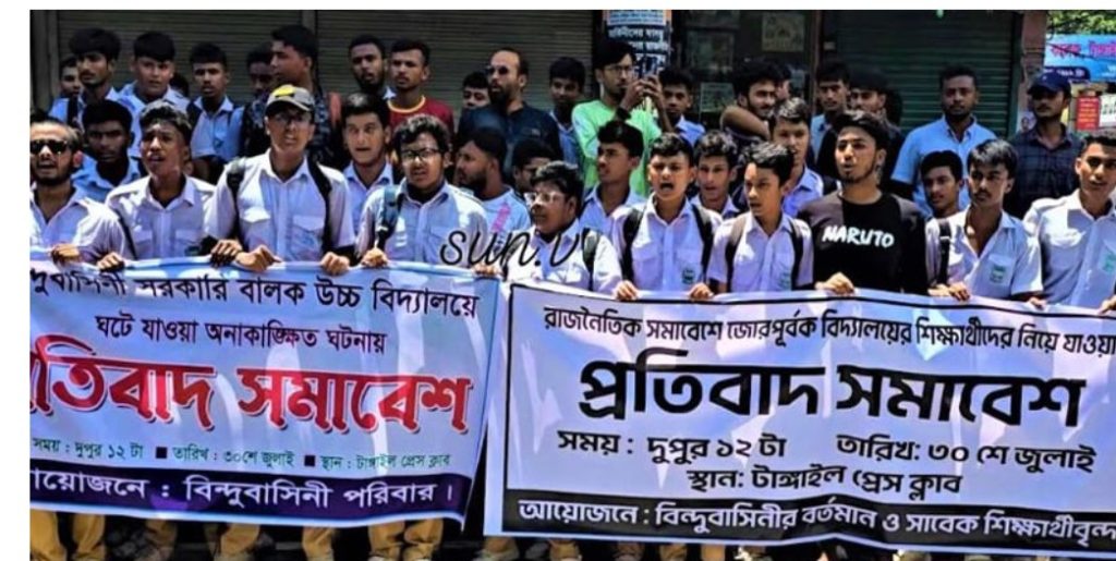 ‎আজ দুপুর সাড়ে ১২টার দিকে বিন্দুবাসিনী সরকারি বালক উচ্চ বিদ্যালয়ের শিক্ষার্থীরা একটি বিক্ষোভ মিছিল নিয়ে শহরের বিভিন্ন সড়ক প্রদক্ষিণ করেন। এরপর তারা টাঙ্গাইল প্রেস ক্লাবের সামনে মানববন্ধন করেন। এ সময় শিক্ষার্থীরা “শিক্ষা প্রতিষ্ঠানে রাজনীতি চলবে না, চলবে না, চলবে না” স্লোগান দেন।