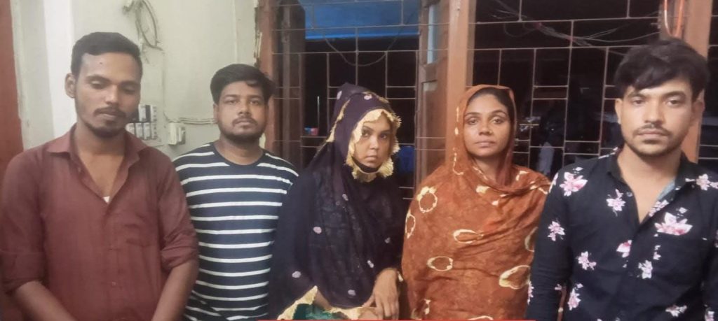 আটককৃতরা হলেন: মো. সোহেল রানা (৩৪), পিতা: মো. সিরাজ খাঁ, গ্রাম: বাখরপুর, ডাকঘর: চামড়াবাজার, থানা: চাঁদপুর সদর, জেলা: চাঁদপুর। মো. আল আমিন (২৫), পিতা: মো. ইব্রাহিম, গ্রাম: তালতলা কানিহারী, ডাকঘর: বরমা, থানা: ত্রিশাল, জেলা: ময়মনসিংহ। মো. সাগর (৩৩), পিতা: মো. বাবুল, গ্রাম: মাসদাইর, ডাকঘর: এনায়েতনগর, থানা: ফতুল্লা, জেলা: নারায়ণগঞ্জ। মোছা. হলকি বেগম (৩৭), পিতা: জিন্নাত হাওলাদার, স্বামী: আলী হোসেন খন্দকার, গ্রাম: উত্তর দুধখালী, ডাকঘর: হবিগঞ্জ, থানা: মাদারীপুর সদর, জেলা: মাদারীপুর। মিতু আক্তার (৩২), পিতা: রফিক মাতুব্বর, স্বামী: রহিম শেখ, গ্রাম: বাওশখালী, ডাকঘর: বল্লকদী, থানা: সালথা, জেলা: ফরিদপুর।