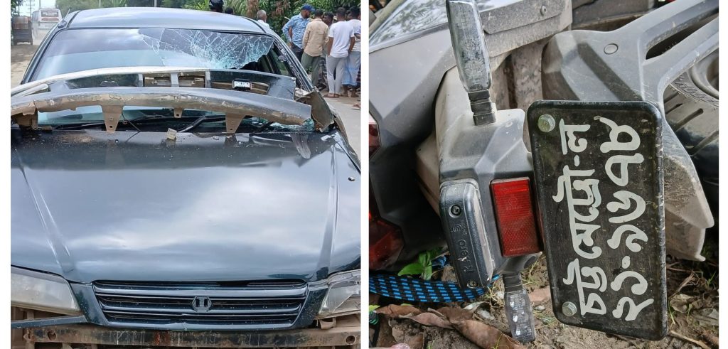 এতে মোটরসাইকেলটি রাস্তার পাশে ছিটকে পড়ে এবং এর দুই আরোহী গুরুতর আহত হন। সংঘর্ষে প্রাইভেট কারটির সামনের অংশও দুমড়েমুচড়ে যায়।