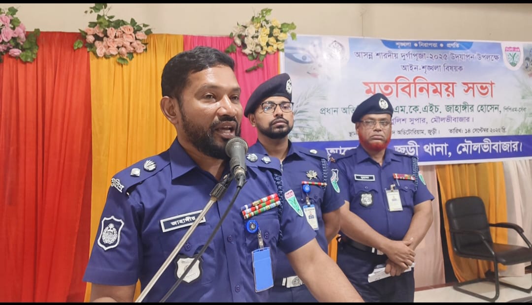 মৌলভীবাজার জেলার জুড়ীতে আসন্ন শারদীয় দুর্গাপূজা ২০২৫ উদযাপন উপলক্ষে এক বিশেষ আইনশৃঙ্খলা বিষয়ক মতবিনিময় সভা অনুষ্ঠিত হয়েছে।