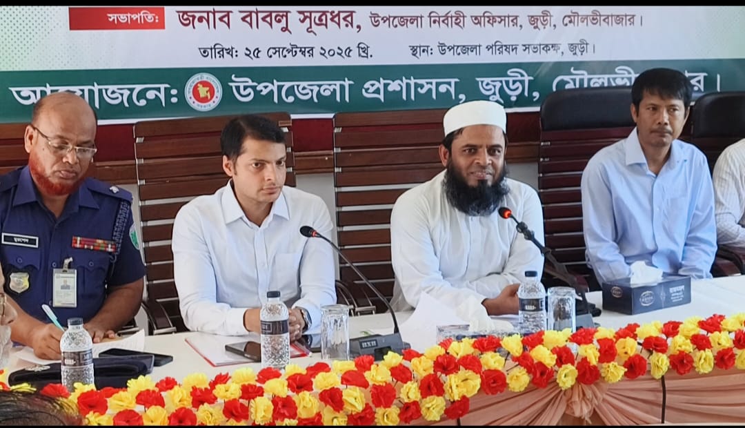 জুড়ী উপজেলা নির্বাহী অফিসার বাবলু সূত্রধর এর সভাপতিত্বে সভায় উপস্থিত ছিলেন জুড়ী থানার ওসি মোঃ মুরশেদুল আলম ভূঁইয়া, উপজেলা দুর্নীতি প্রতিরোধ কমিটির সভাপতি প্রবীণ শিক্ষাবিদ মো: তাজুল ইসলাম, উপজেলা বিএনপির সভাপতি মাছুম রেজা, জেলা জামায়াতের নায়েবে আমির মাওলানা আব্দুর রহমান, উপজেলা জামায়াতের আমির আব্দুল হাই হেলাল, পিডিবি’র আবাসিক প্রকৌশলী মোঃ কবীর আহমেদ,