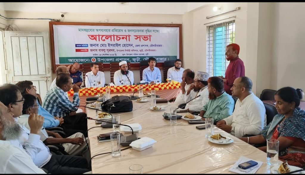 মৌলভীবাজার জেলার জুড়ী উপজেলায় মাদকদ্রব্যের অপব্যবহার প্রতিরোধ ও জনসচেতনতা বৃদ্ধির লক্ষ্যে আলোচনা সভা অনুষ্ঠিত হয়েছে। বৃহস্পতিবার (২৫ সেপ্টেম্বর) বেলা ২ ঘটিকায় উপজেলা প্রশাসনের আয়োজনে উপজেলা পরিষদ সভাকক্ষে অনুষ্ঠিত সভায় প্রধান অতিথি হিসেবে উপস্থিত ছিলেন মৌলভীবাজার জেলার জেলা প্রশাসক মো: ইসরাইল হোসেন।