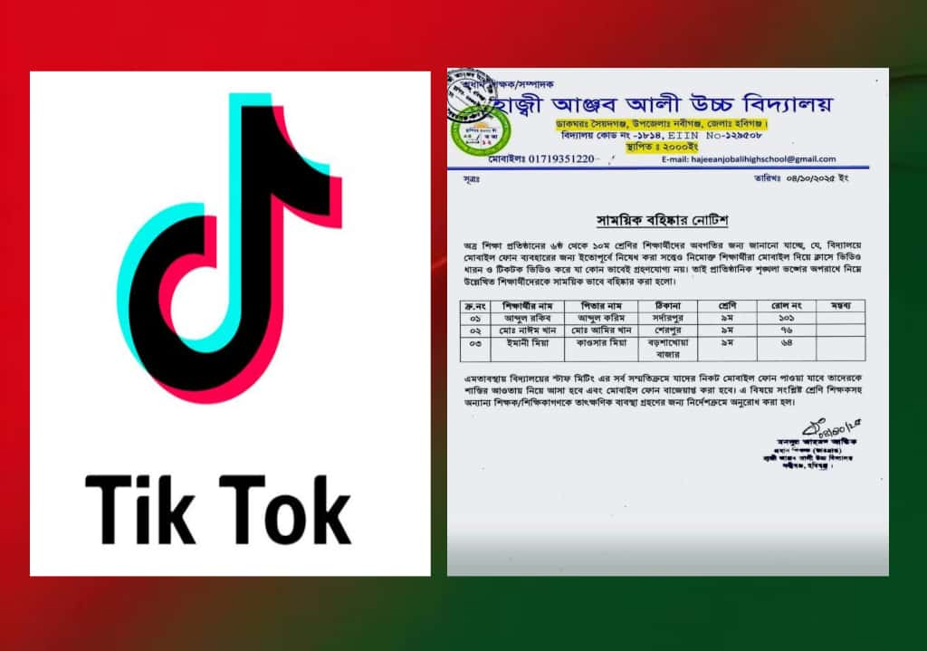 হবিগঞ্জের নবীগঞ্জ উপজেলার হাজী আঞ্জব আলী উচ্চ বিদ্যালয়ের তিন শিক্ষার্থীকে ক্লাস চলাকালীন মোবাইল ফোনে ভিডিও ধারণ ও টিকটক ভিডিও তৈরির অভিযোগে সাময়িকভাবে বহিষ্কার করা হয়েছে।