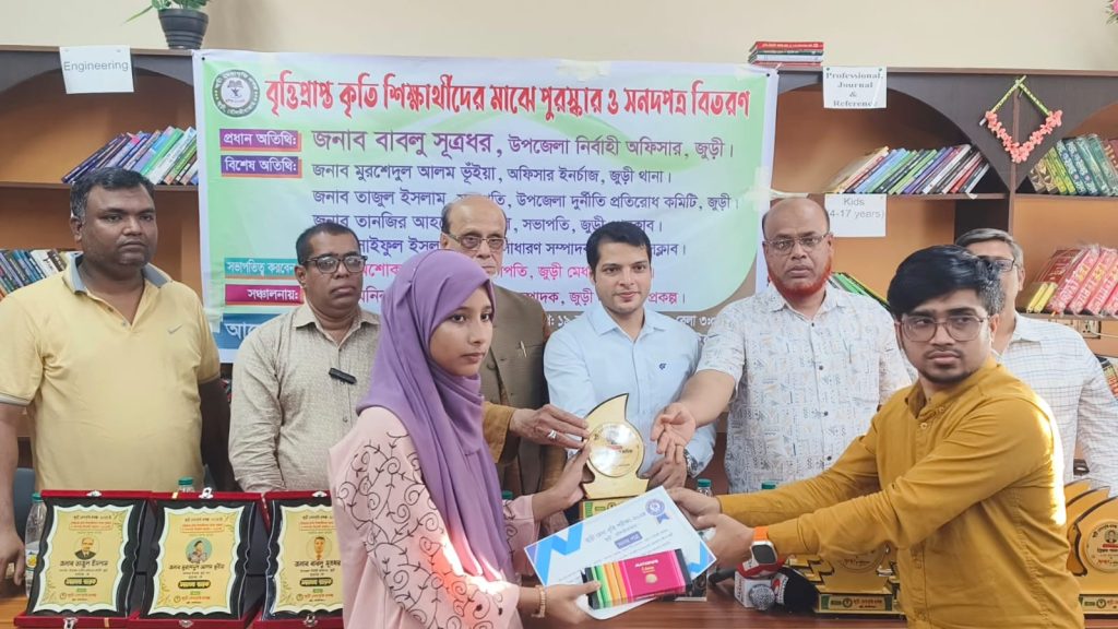 মৌলভীবাজার জেলার জুড়ীতে ‘জুড়ী মেধাবৃত্তি’ পরীক্ষায় বৃত্তিপ্রাপ্ত কৃতি শিক্ষার্থীদের মাঝে পুরষ্কার ও সনদপত্র প্রদান করা হয়েছে।