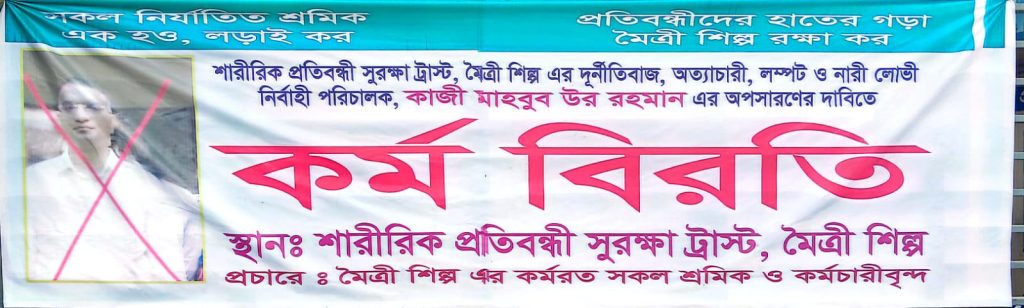 তাছাড়া যন্ত্রপাতিতে সমস্যা দেখা দিলে সংশ্লিষ্ট কর্মীদের বিনা কারণে বদলি বা নোটিশ দেওয়ায় শ্রমিকদের মধ্যে আতঙ্ক বিরাজ করছে। অভিযোগের বিষয়ে শ্রমিকরা সমাজকল্যাণ উপদেষ্টা, শারীরিক প্রতিবন্ধী সুরক্ষা ট্রাস্টের চেয়ারম্যান, সমাজকল্যাণ মন্ত্রণালয়ের সচিব, জনপ্রশাসন মন্ত্রণালয়ের সিনিয়র সচিব, গাজীপুর জেলা প্রশাসক, গাজীপুর মেট্রোপলিটন পুলিশ কমিশনার ও মন্ত্রিপরিষদ বিভাগে লিখিতভাবে জানানো হয়েছে।
