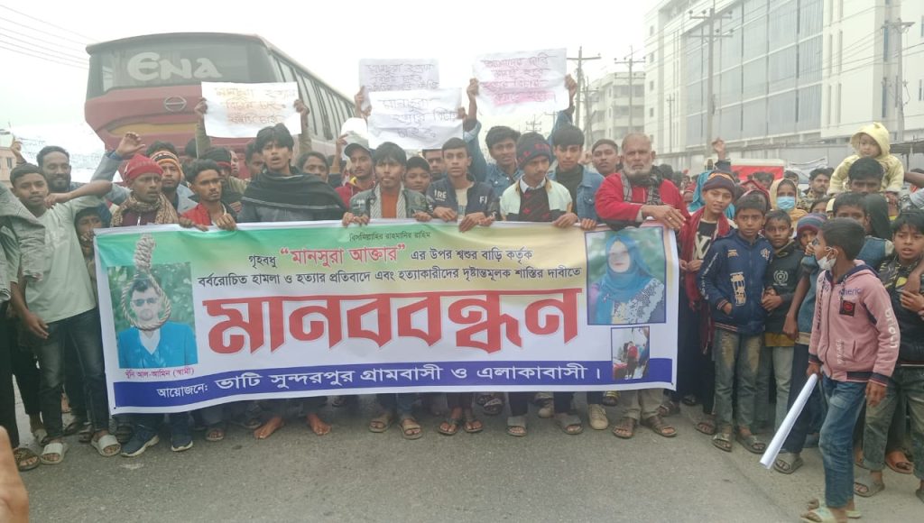 বক্তারা আরও অভিযোগ করেন, মানসুরাকে হত্যা করে স্বামীসহ তার পরিবার আত্মহত্যা বলে প্রশাসনে মিথ্যা তথ্য দিয়েছে এবং প্রকৃত হত্যাকাণ্ডকে ভিন্নখাতে প্রবাহিত করার চেষ্টা করা হয়েছে। একটি নিরাপদ সমাজ গড়তে নারীর প্রতি সহিংসতার বিরুদ্ধে সবাইকে ঐক্যবদ্ধ হওয়ার আহ্বান জানান তারা। একই সঙ্গে মানববন্ধনের মাধ্যমে প্রশাসনের দৃষ্টি আকর্ষণ করে দ্রুত ও নিরপেক্ষ তদন্তের দাবি জানানো হয়।