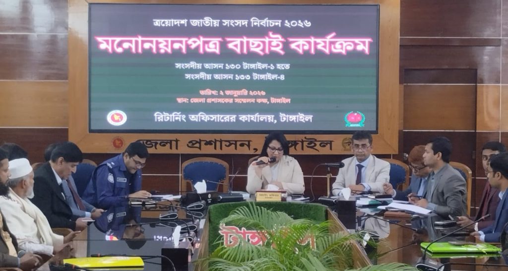 শনিবার (৩ জানুয়ারি) বাকি ৪টি আসনের মনোনয়নপত্র যাচাই-বাছাই করা হবে। আসনগুলো হলো,টাঙ্গাইল-৫ (সদর), টাঙ্গাইল-৬ (নাগরপুর-দেলদুয়ার), টাঙ্গাইল-৭ (মির্জাপুর) এবং টাঙ্গাইল-৮ (বাসাইল-সখীপুর)।