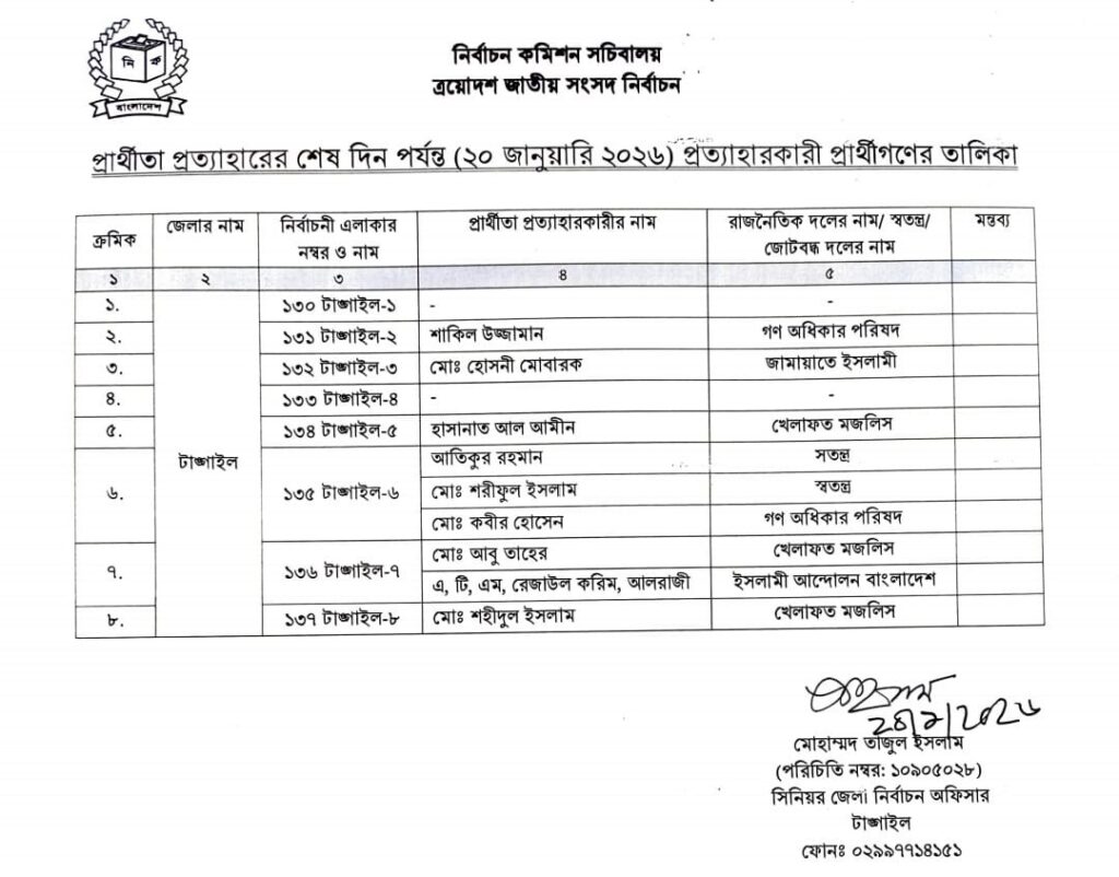 টাঙ্গাইল জেলা নির্বাচন অফিসের সিনিয়র জেলা নির্বাচন অফিসার মোহাম্মদ তাজুল ইসলাম টাঙ্গাইলের ৯জনের প্রার্থীতা প্রত্যাহারের বিষয়টি নিশ্চিত করেন।