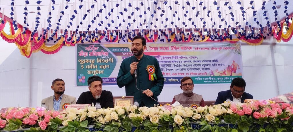 ‎হবিগঞ্জের বানিয়াচংয়ে অবস্থিত স্বনামধন্য শিক্ষা প্রতিষ্ঠান ডা: ইলিয়াছ একাডেমি উচ্চ বিদ্যালয়ের উদ্যোগে বার্ষিক ক্রীড়া প্রতিযোগিতা,পুরস্কার বিতরণী অনুষ্ঠান আড়ম্বরপূর্ণভাবে অনুষ্ঠিত হয়েছে। বৃহস্পতিবার ২৯ জানুয়ারি বিদ্যালয় প্রাঙ্গণে আয়োজিত এই অনুষ্ঠানে প্রধান অতিথি হিসেবে উপস্থিত ছিলেন হবিগঞ্জ কৃষি বিশ্ববিদ্যালয়ের ভাইস চ্যান্সেলর প্রফেসর ড. সৈয়দ সায়েম উদ্দিন আহম্মদ।
