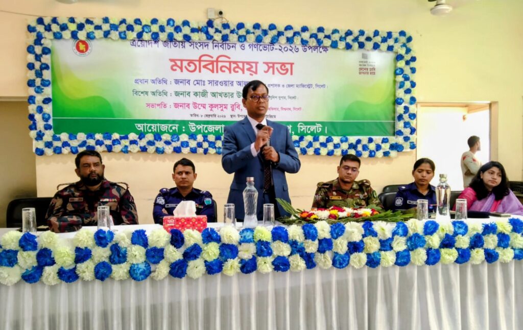 রোববার দুপুরে উপজেলা অডিটোরিয়াম হলরুমে উপজেলা প্রশাসনের আয়োজনে এই মতবিনিময় সভা অনুষ্ঠিত হয়। সহকারি রিটার্ণিং কর্মকর্তা ও উপজেলা নির্বাহী কর্মকর্তা উম্মে কুলসুম রুবি’র সভাপতিত্বে ও উপজেলা সহকারি কমিশনার (ভূমি) মোঃ লুৎফুর রহমানের পরিচালনায় সভায় প্রধান অতিথি হিসেবে দিক-নির্দেশনা মূলক বক্তব্য রাখেন সিলেটের রিটার্ণিং কর্মকর্তা ও জেলা প্রশাসক মোঃ সারওয়ার আলম।