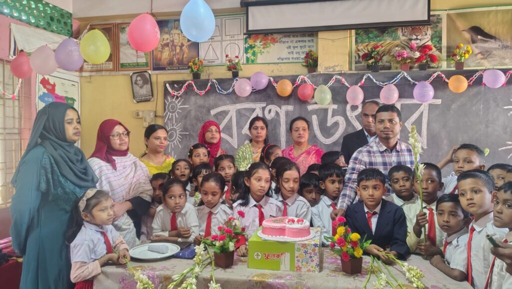 বিদ্যালয়ের পক্ষ থেকে ও ফুল দিয়ে কেক কেটে বরণ করা হয় কোমলমতি শিশুদের।