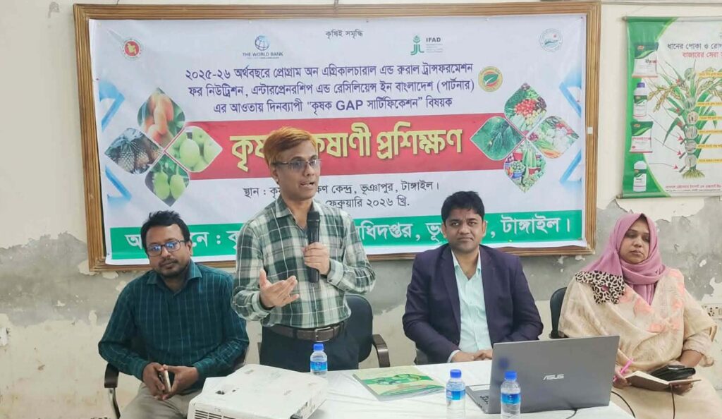 টাঙ্গাইলের ভূঞাপুরে ২০২৫-২৬ অর্থবছরে ‘প্রোগ্রাম অন এগ্রিকালচারাল এন্ড রুরাল ট্রান্সফরমেশন ফর নিউট্রিশন, এন্টারপ্রেনরশিপ এন্ড রেসিলিয়েন্স ইন বাংলাদেশ’ (পার্টনার) প্রকল্পের আওতায় দিনব্যাপী কৃষক প্রশিক্ষণ অনুষ্ঠিত হয়েছে। বুধবার (১৮ ফেব্রুয়ারি) উপজেলা কৃষি সম্প্রসারণ অধিদপ্তরের আয়োজনে উপজেলা কৃষক প্রশিক্ষণ কেন্দ্রে “কৃষক GAP সার্টিফিকেশন” বিষয়ক এই প্রশিক্ষণ সম্পন্ন হয়।