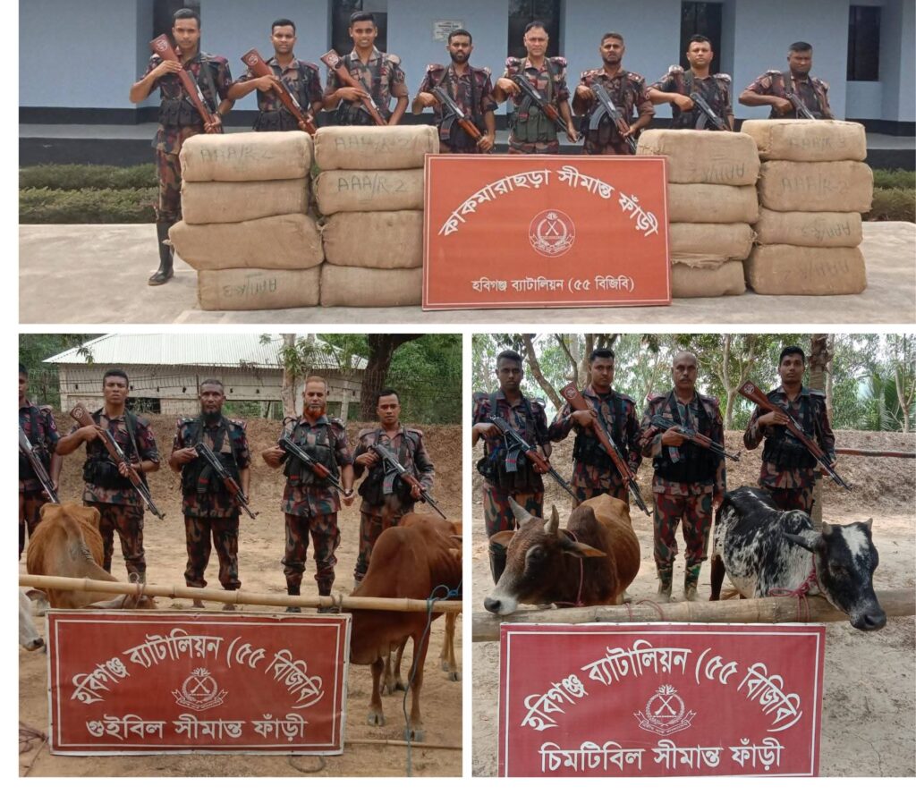 ‎অন্যদিকে হবিগঞ্জের চুনারুঘাট উপজেলার গুইবিল ও চিমটিবিল বিওপির টহলদল সীমান্ত এলাকায় পৃথক অভিযানে ১০টি ভারতীয় গরু জব্দ করে। এসব গরুর আনুমানিক মূল্য প্রায় ৮ লাখ টাকা বলে বিজিবি জানিয়েছে।