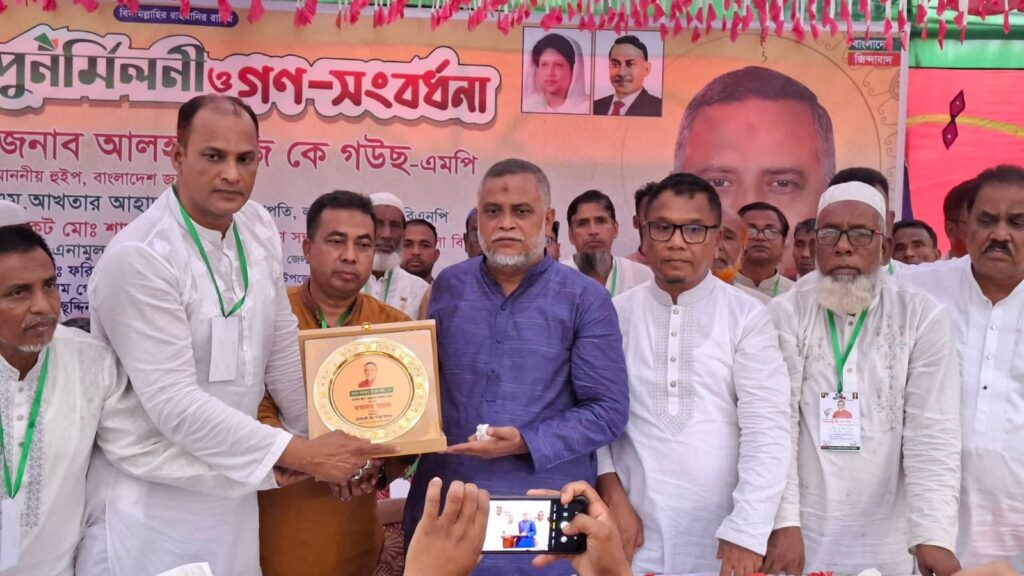 সভায় আলোচনা শেষে প্রধান অতিথি ও সংবর্ধিত ব্যক্তিত্ব আলহাজ্ব জি কে গউছ এর হাতে সন্মাননা স্মারক ক্রেস্ট তুলে দেওয়া হয়।