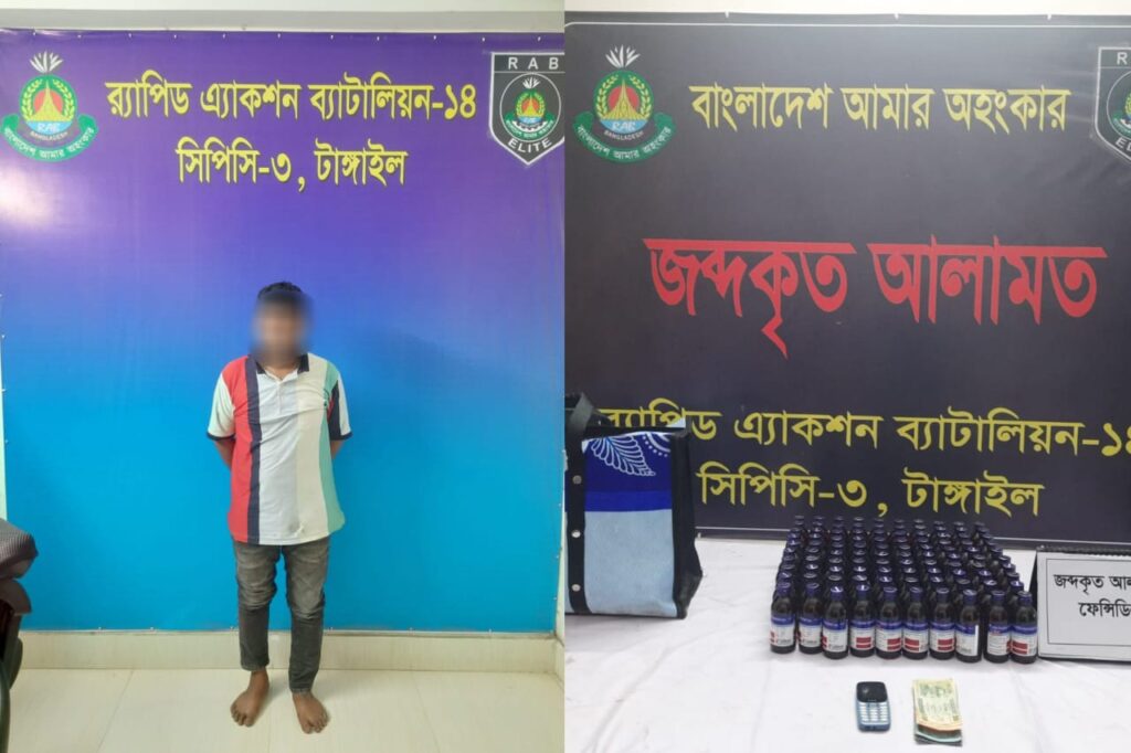 টাঙ্গাইলের মির্জাপুরে র্যাবের মাদকবিরোধী অভিযানে ১০০ বোতল নেশাজাতীয় অবৈধ মাদকদ্রব্য ‘এস্কাফ সিরাপ’ উদ্ধারসহ এক মাদককারবারিকে গ্রেফতার করা হয়েছে।