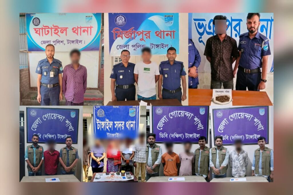 টাঙ্গাইল জেলা পুলিশের নিয়মিতমাদকবিরোধী ও অপরাধ দমন অভিযান গত ২৪ ঘণ্টায় জেলার বিভিন্ন থানায় পরিচালিত হয়েছে। পুলিশের তৎপরতায় মোট ২২ জনকে গ্রেফতার করা হয়েছে, যাদের মধ্যে ১৪ জন মূলত মাদক ব্যবসায়ী যারা ইয়াবা ও গাঁজাসহ নেশা জাতীয় অবৈধ কর্মকাণ্ডে জড়িত ছিল।