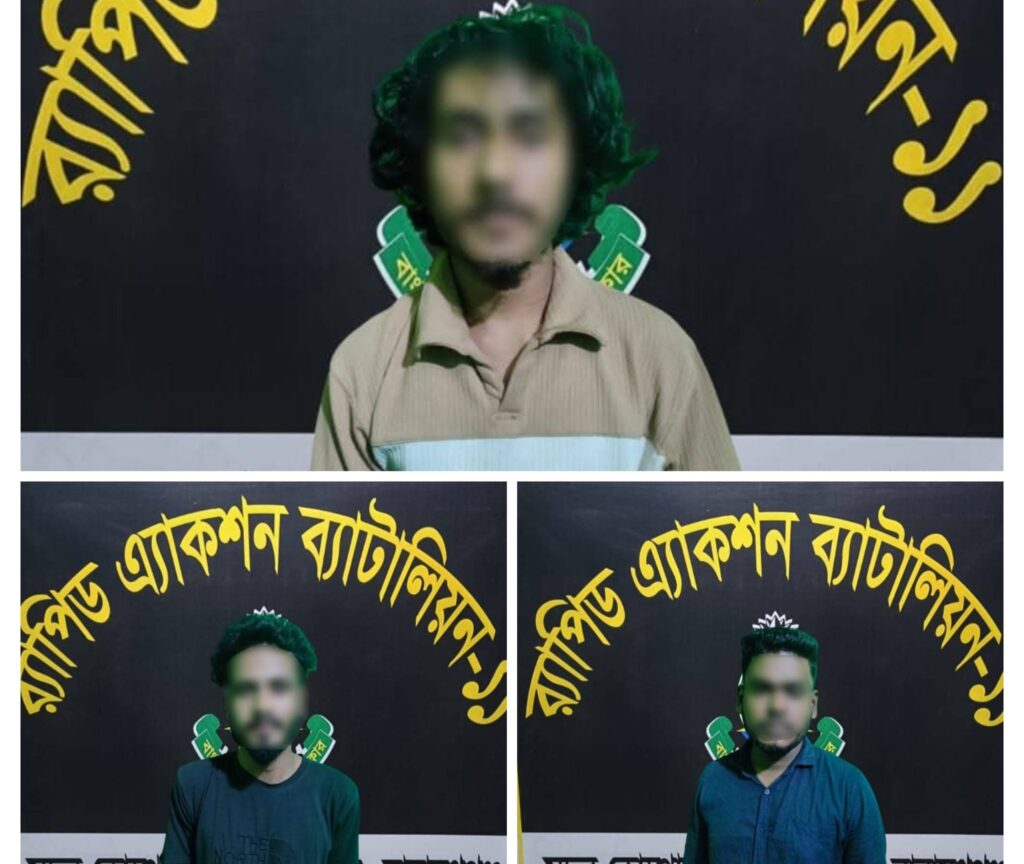 ‎গ্রেপ্তার ব্যক্তিরা হলেন-সুনামগঞ্জ জেলার ছাতক উপজেলার রাধানগর গ্রামের মৃত ছায়েদ আলীর ছেলে সুবেল মিয়া (২৭), একই গ্রামের নসামসুদ্দিনের ছেলে আফজাল হোসেন (২৬) এবং শান্তিগঞ্জ উপজেলার মীর্জাপুর গ্রামের নুরুল আমীনের ছেলে জোবায়ের হোসেন (২৬)।