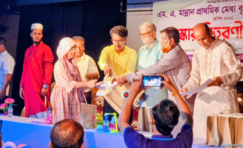 সুনামগঞ্জের শান্তিগঞ্জে এম.এ. মান্নান প্রাথমিক মেধা বৃত্তি পরীক্ষা-২০২৫ খ্রি: ৭৯৭ জন পরীক্ষার্থী অংশ গ্রহণকারীর মধ্যে প্রতিটি উপজেলায় ১ম গ্রেডে-১০ জন এবং ২য় গ্রেডে-১৫ জন, মোট-২৫ জন করে, জেলার ৩টি উপজেলায় দক্ষিণ সুনামগঞ্জ (শান্তিগঞ্জ),জগন্নাথপু ও সুনামগঞ্জ সদর সহ মোট-৭৫ জন মেধাবী শিক্ষার্থীদের মাঝে বৃত্তি ও সনদ প্রদান প্রদান করা হয়েছে।