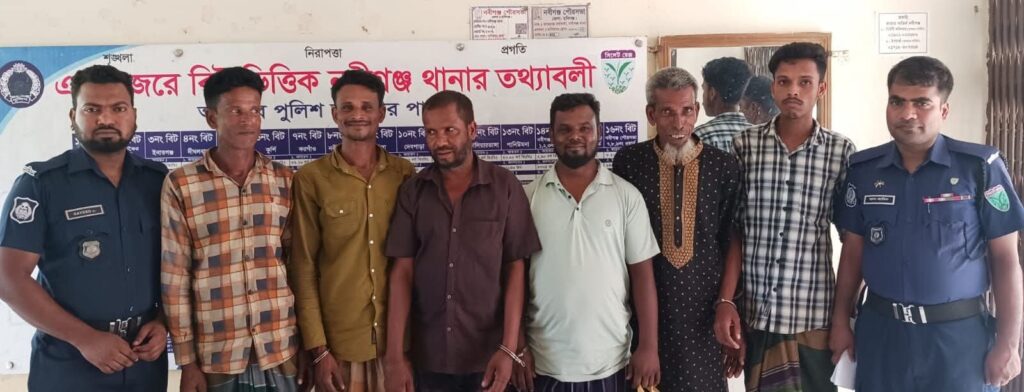 গ্রেপ্তার ব্যক্তিরা হলেন- উপজেলার সাতাইহাল গ্রামের মৃত জাবেদ উল্লাহর ছেলে আব্দুর রহিম (৪৫), আব্দুর রহমানের ছেলে আব্দুল মতলিব (৪০), মৃত মছবর উল্লার ছেলে মো. আব্দুল মতলিব (৬৮), তাঁর ছেলে মুহিবুর রহমান (২৫), আব্দুল মান্নানের ছেলে আব্দুল আহাদ (৩০) এবং পুরানগাঁও গ্রামের আবুল মিয়ার ছেলে জিয়াউর রহমান।