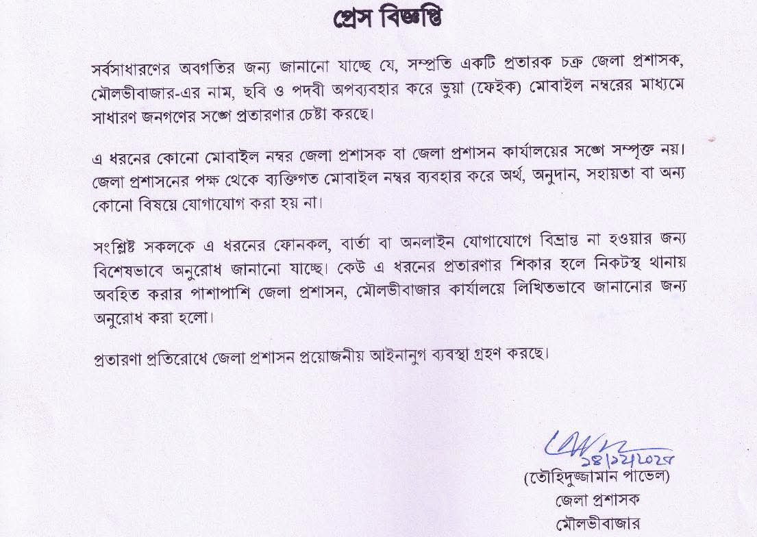 মৌলভীবাজারে ভুয়া মোবাইল নম্বর ব্যবহার করে প্রতারণার চেষ্টা, সতর্ক থাকার আহ্বান জেলা প্রশাসনের