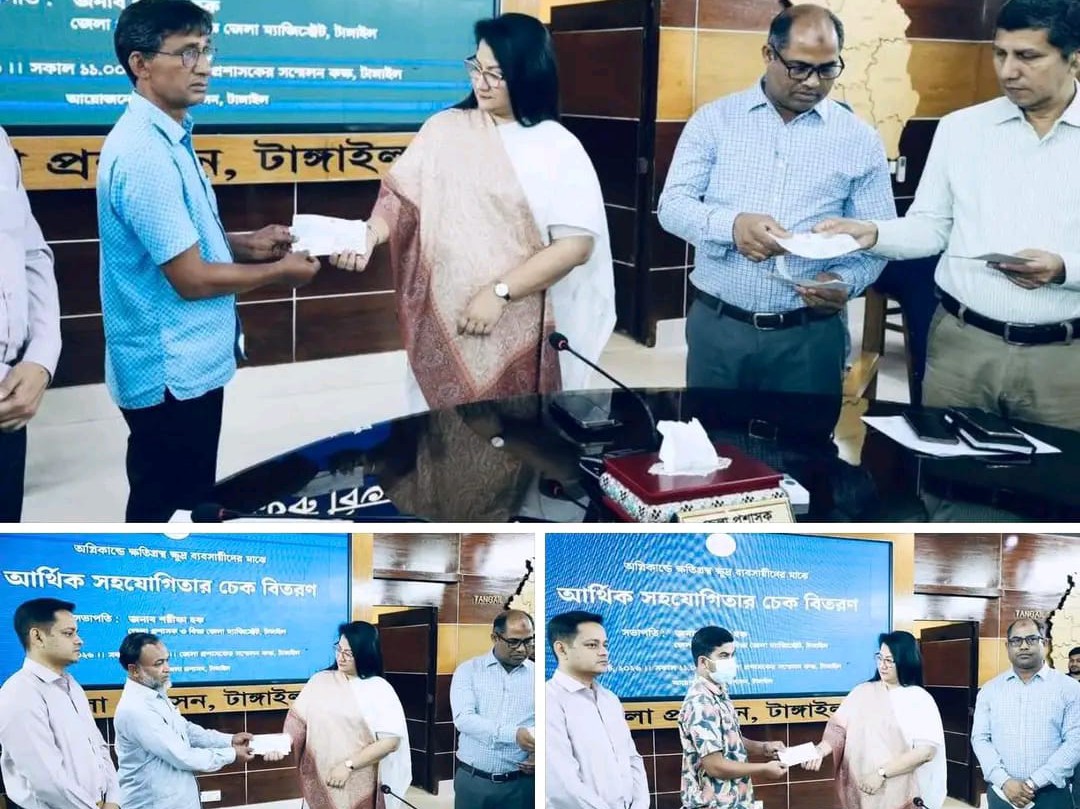 টাঙ্গাইলে অগ্নিকাণ্ডে ক্ষতিগ্রস্ত ১২ ক্ষুদ্র ব্যবসায়ীর মাঝে আর্থিক সহায়তার চেক প্রদান